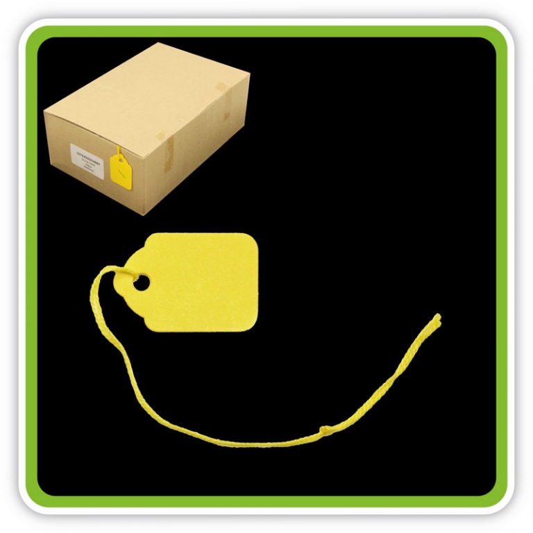 Quality Strung Yellow Tickets 32mm x 22mm Strong and durable yellow tickets, which are pre-strung for easy use and are ideal for pricing, colour coding, identifying and labelling a wide range of products, from small items of jewellery to larger items of clothing etc.