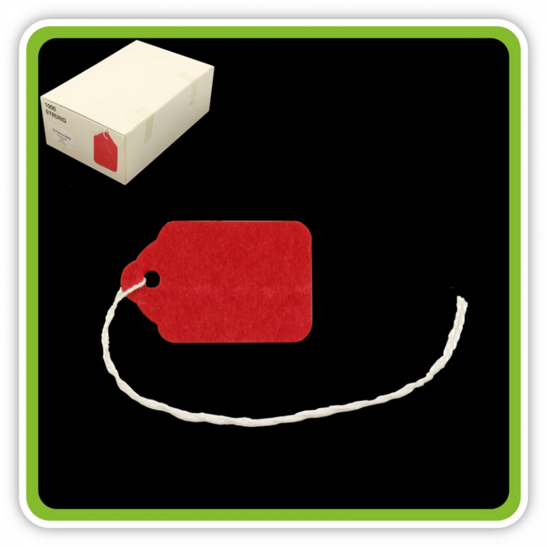 Strong and durable red tickets, which are pre-strung for easy use and are ideal for pricing, colour coding, identifying and labelling a wide range of products, from small items of jewellery to larger items of clothing etc.