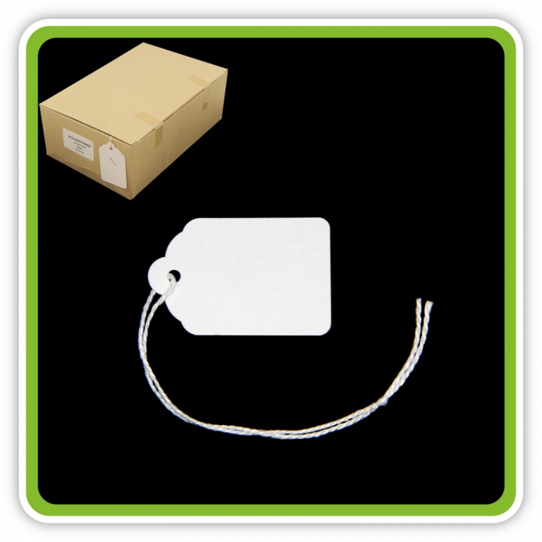 Strong and durable white tickets, which are pre-strung for easy use and are ideal for pricing and labelling a wide range of products, from small items of jewellery to larger items of clothing etc.