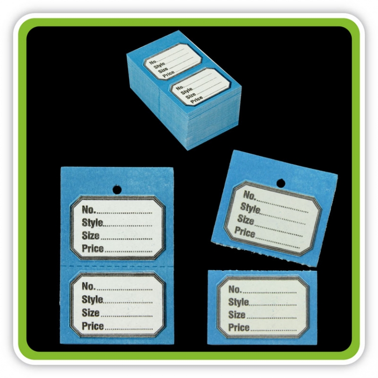 Strong and durable clothing tickets, printed with border and the wording: No. / Style / Size / Price providing quick identification of the garment.